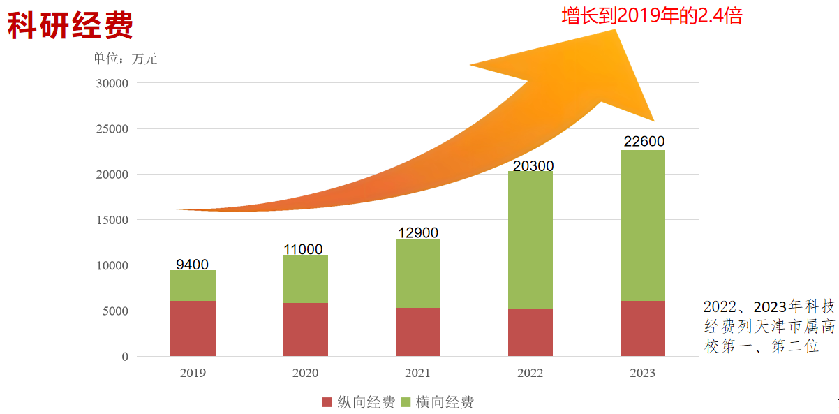 自学校第二次党代会以来,获批国家重点研发计划、自然科学基金、社会科学基金等382项。2023年国家自然科学基金项目立项数(50项)再创历史新高,立项数在天津市综合类地方高校中获批项目数排名第一。2022年、2023年科技经费位居市属高校第一、第二位,形成了4个“亿元级”科研项目群。2018年以来,科研经费增长2.4倍,由2018年的9400万元增长到2.26亿元。高水平理论创新成果不断攀升,发表的国际一区论文从2019年的86篇增长到2023年的201篇,增长2.3倍。研究人员在Nature、Science国际顶刊发表论文6篇。近5年累计获批省部级以上科研奖励41项。2021年,电气电子工程学院(现为电气工程与自动化学院)教授张宝峰联合天津大学等单位共同研发的“多轴联动多传感器协同现场坐标测量技术及应用”成果荣获国家科技进步奖二等奖,我校时隔七年再度获批国家级科技成果奖励。