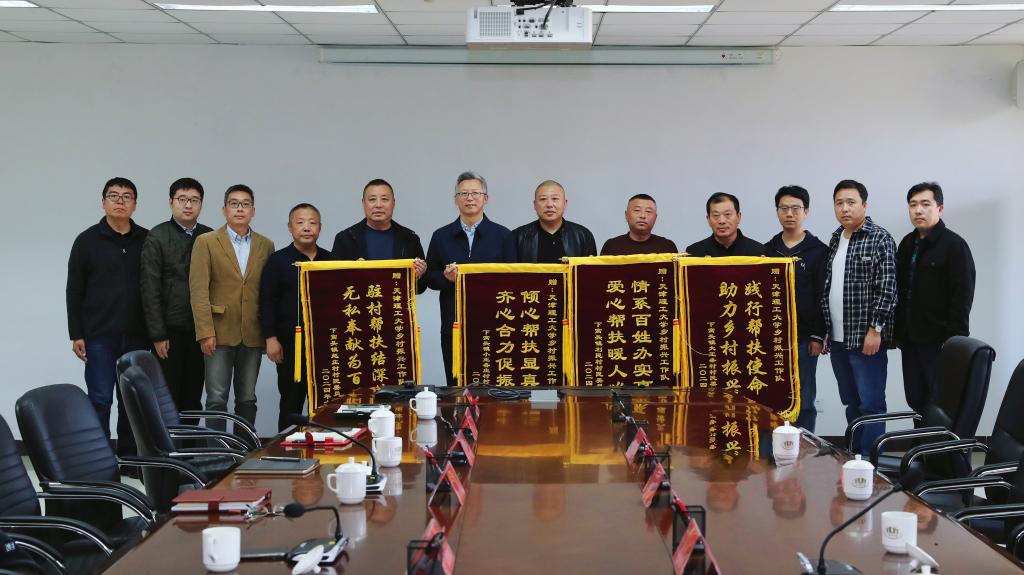 日前,我校上一轮扶持经济薄弱村两委代表一行来校赠送锦旗,表达对我校三年来驻村工作的感谢。党委组织部负责同志和上一轮驻村工作队全体成员与村两委代表亲切座谈。