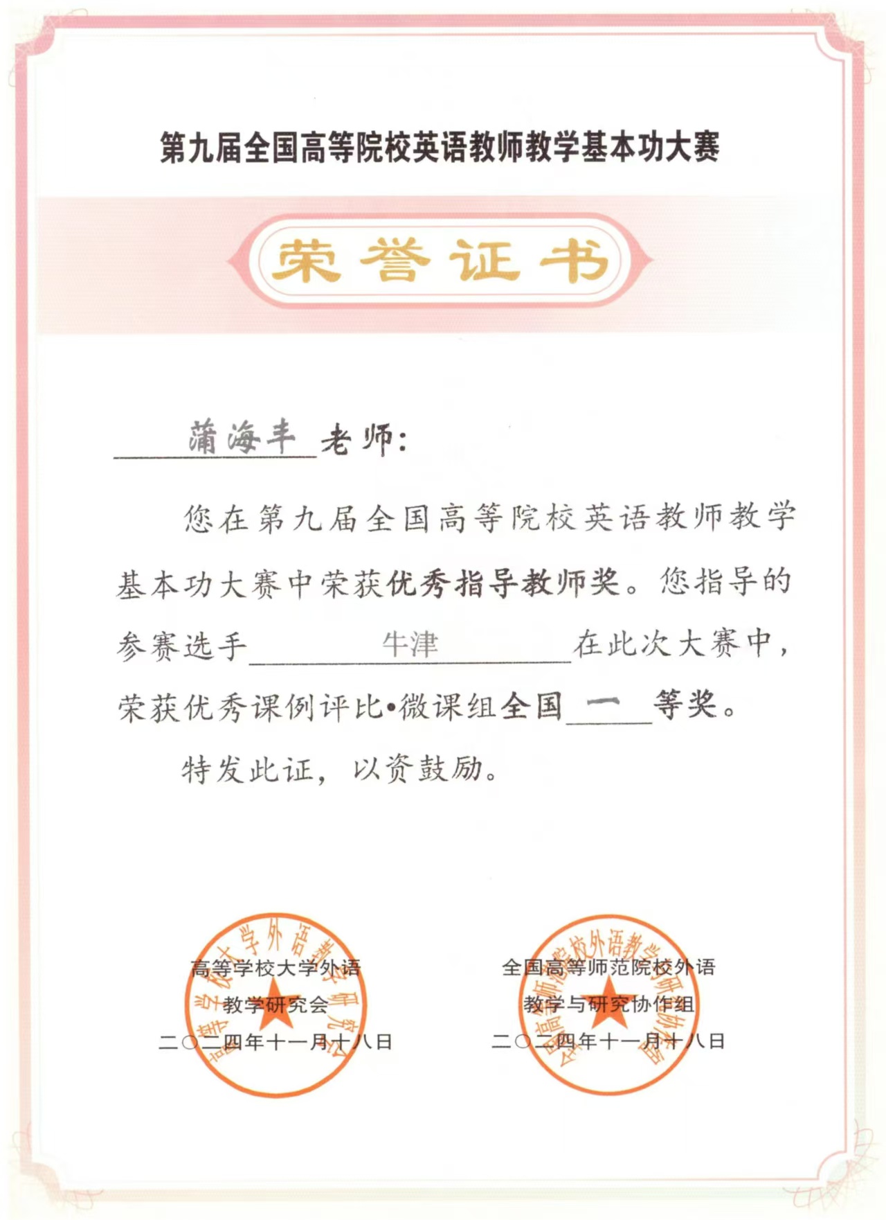 2024年全国高等院校英语教学学术年会暨第九届全国高等院校英语教师教学基本功大赛在湖北省武汉市举办。我校语言文化学院英语系教师牛津荣获优秀课例评比•微课组全国一等奖,蒲海丰荣获优秀指导教师奖。