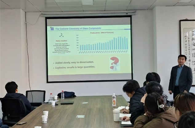 毕锡和以《邻三氟甲基苯磺酰腙(Triftosylhydrazone)》为题作学术报告。他详细介绍了课题组在卡宾化学中的研究策略和主要研究成果。围绕设计开发的邻三氟甲基苯磺酰腙试剂开展了系统性的研究工作,在有机分子骨架编辑方向取得了突破性进展,推动了卡宾化学的发展。