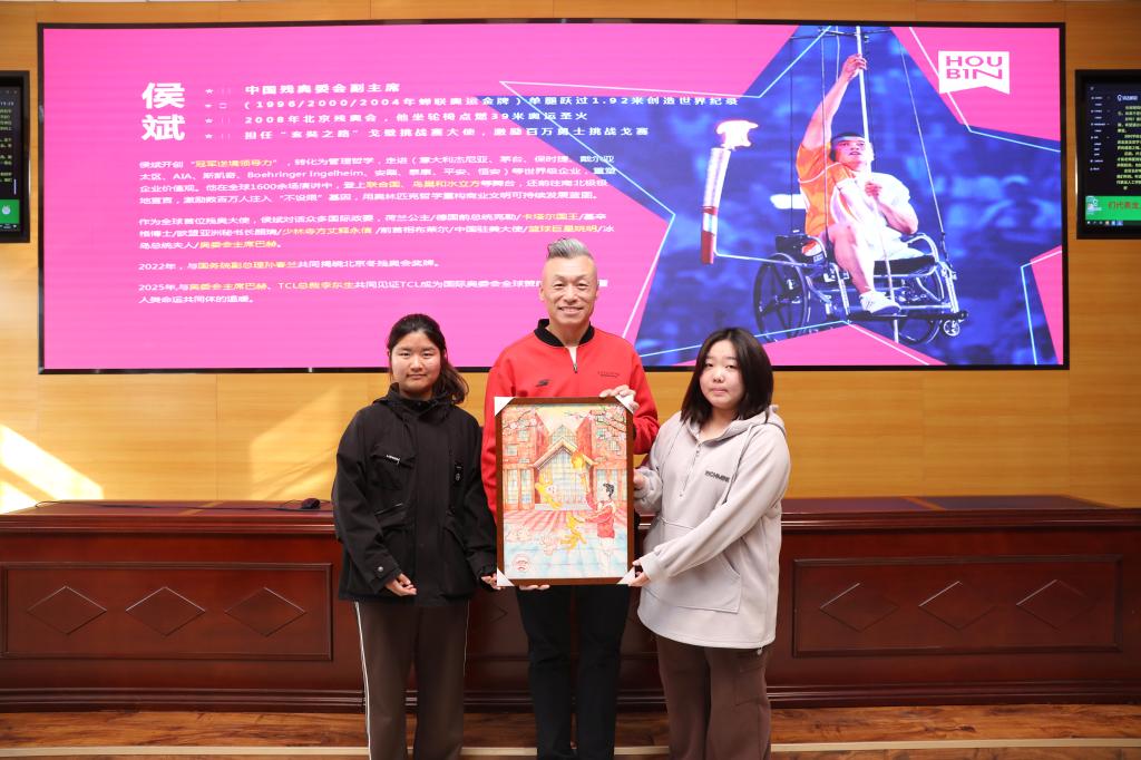 讲座结束后,许瑞代表学校向侯斌赠送了听障学生设计的文创纪念品;听障生代表送上了亲手绘制的传递自强不息精神的绘画作品。