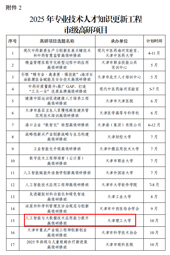 近日,天津市人社局发布《市人社局关于公布2025年专业技术人才知识更新工程高级研修项目计划的通知》(津人社办函〔2025〕131号),我校申报的“人工智能核心技术应用高级研修班”(国家级高研项目)和“人工智能与大数据技术应用能力提升高级研修班”(市级高研项目)均获批立项。