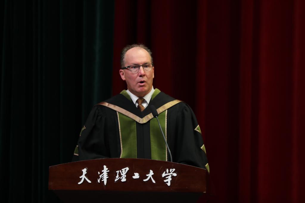 Brett Fairbairn发表讲话,对两校长期的合作成就予以高度评价,并鼓励毕业生们勇敢追梦,迎接未来挑战。