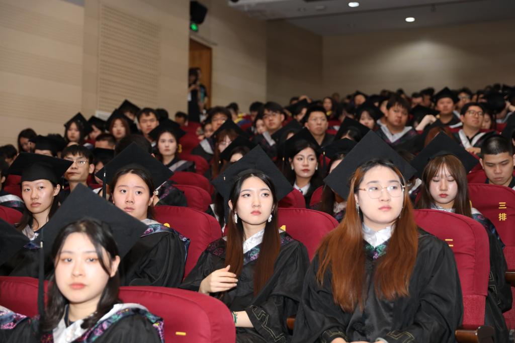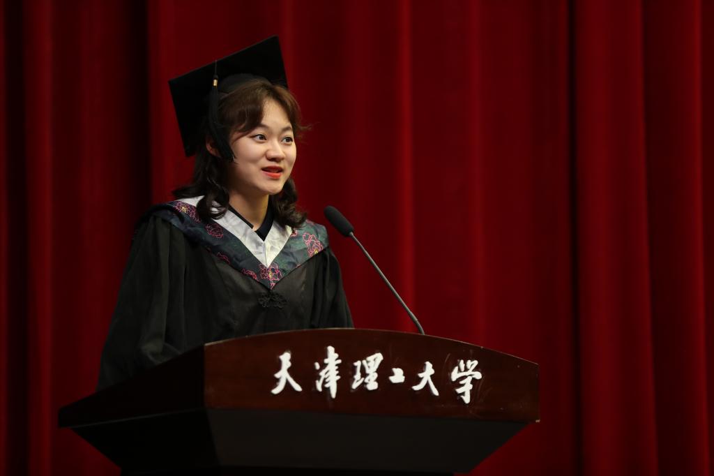 毕业生代表、管理学院王润以双语致辞,感谢学校和老师们的培养,表示将在今后的工作和学习中继续努力、勇敢拼搏。