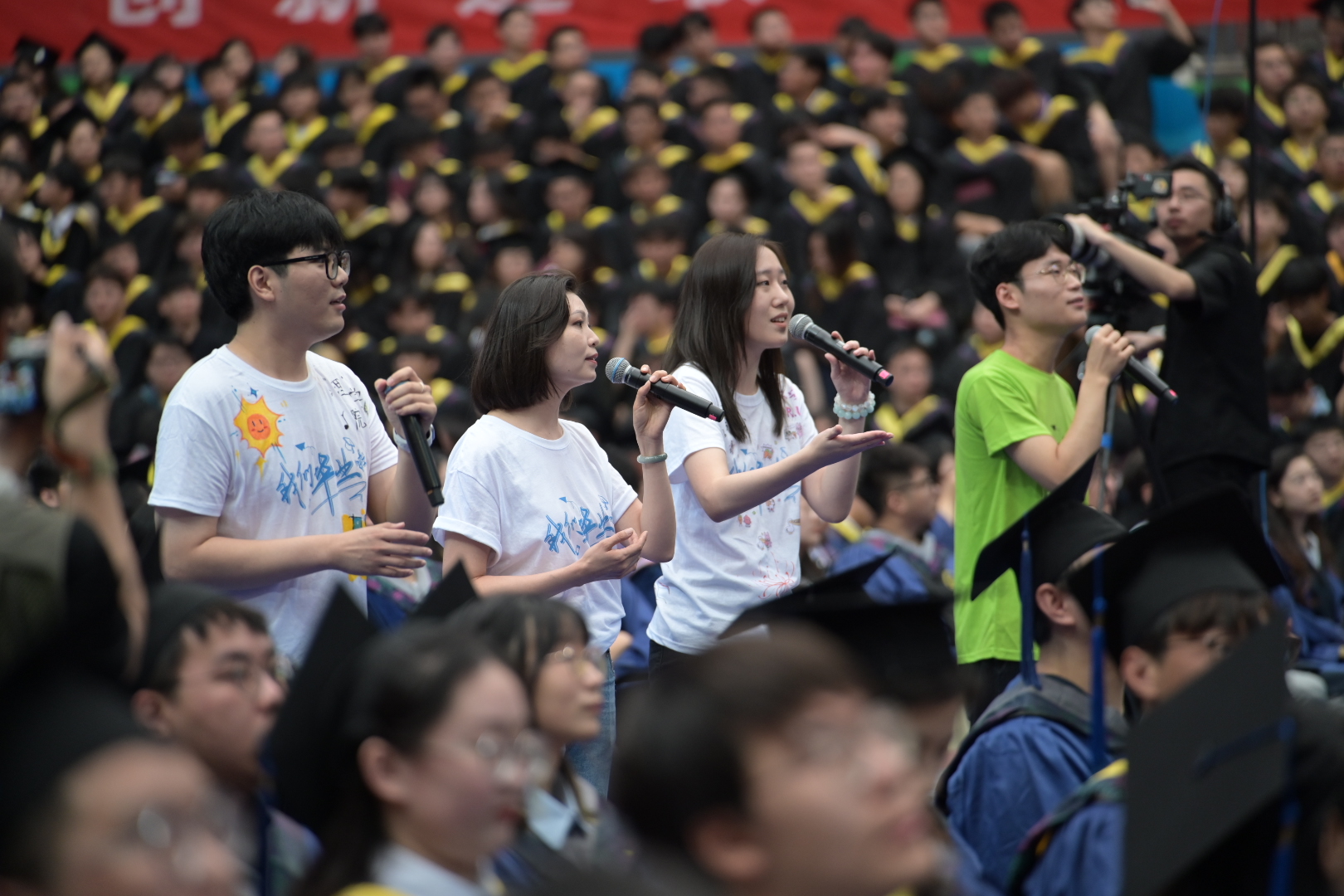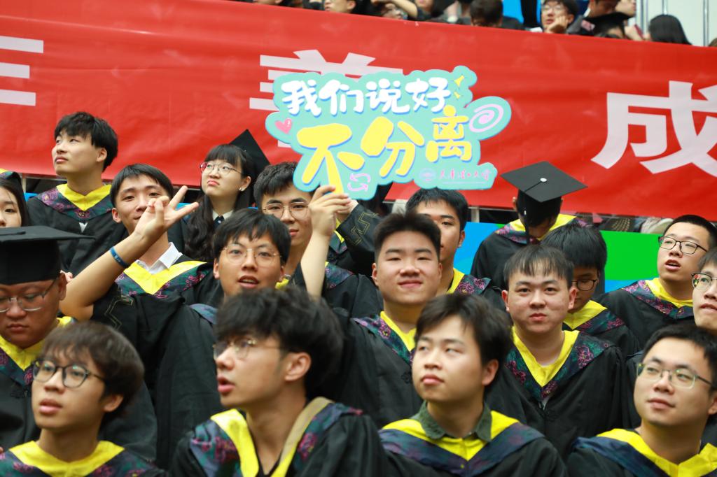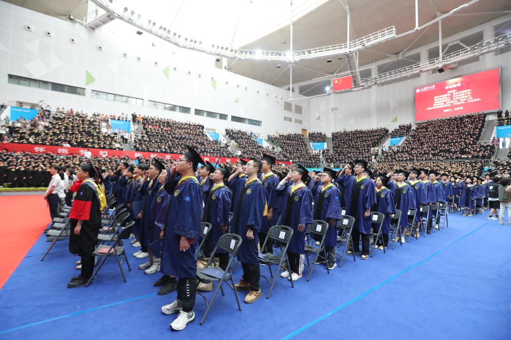 陆胜兰带领全体毕业生庄严宣誓:“践行天理校训,传承天理精神,重德重能做人,求实求新干事。厚植家国情怀,立志民族复兴,报效祖国,奉献社会,服务人民。以奋斗姿态激扬青春,不负时代,不负华年。”