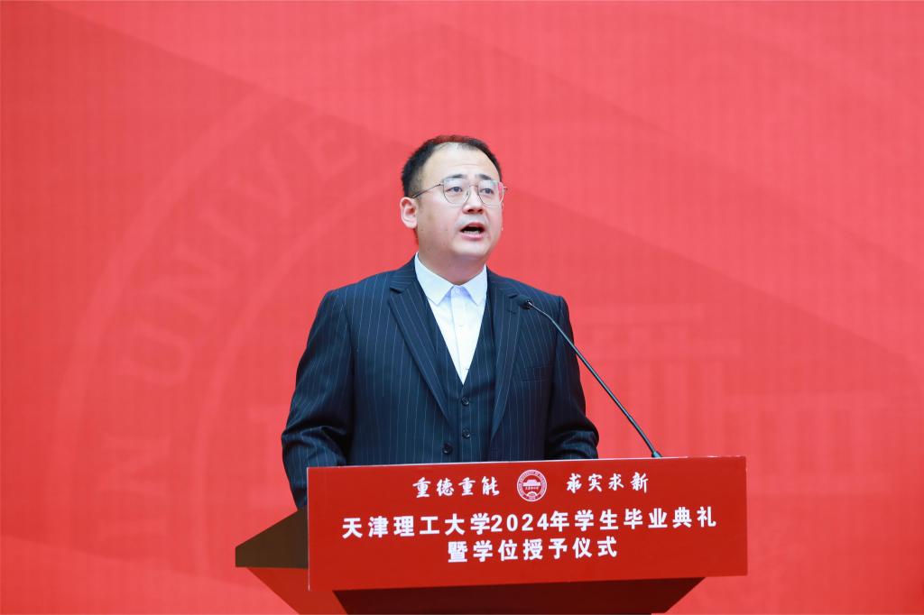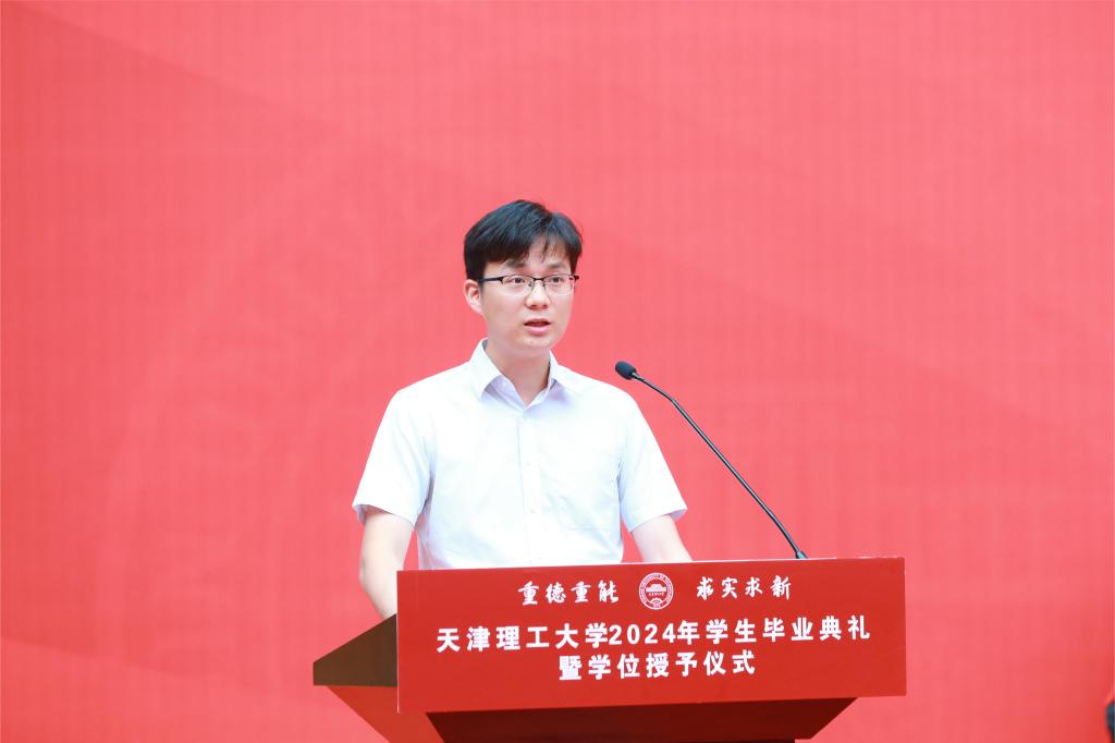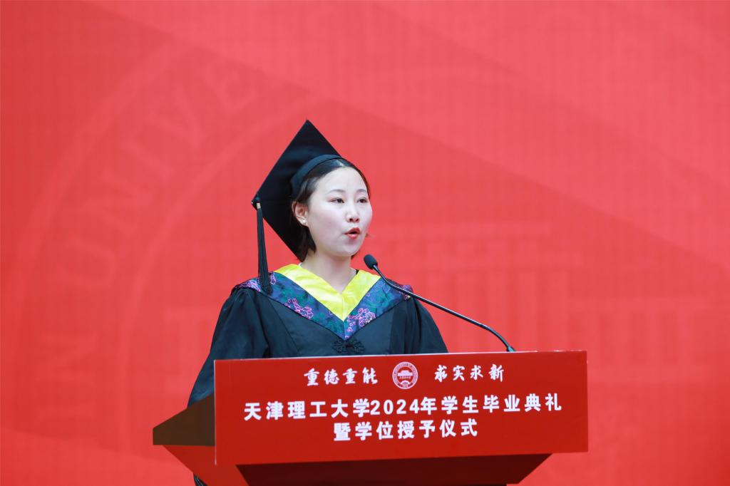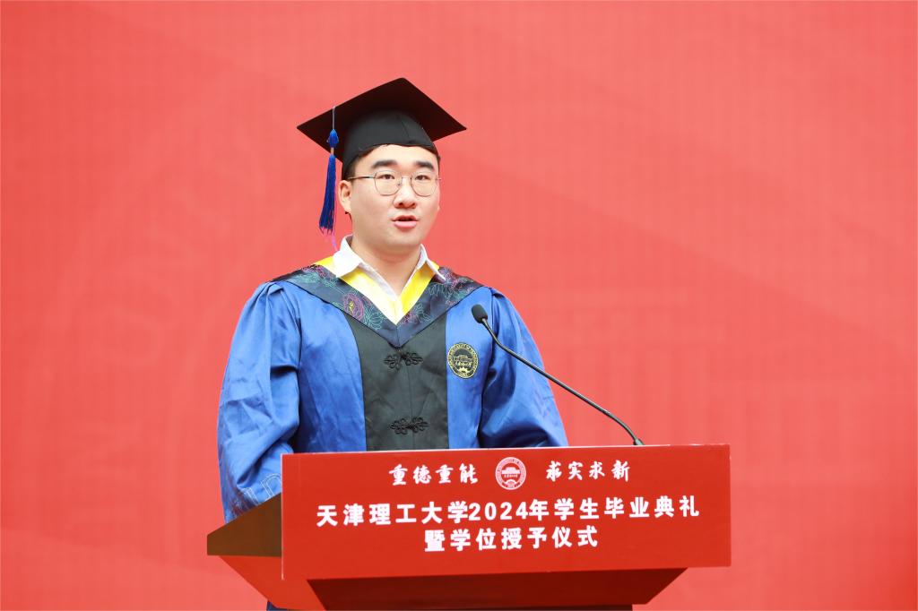 研究生毕业生代表、化学化工学院研究生阎浩冉在发言中分享了自己的科研感悟,表达了对学校和老师们的崇高敬意和衷心感谢。他号召大家牢记“重德重能,求实求新”的校训,不忘新时代青年的责任与担当,为强国建设、民族复兴贡献天理人的力量。