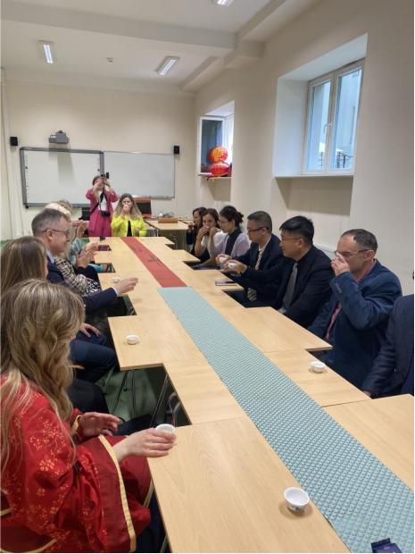 座谈会后,两校代表来到孔子学院,Bogumila Anna Kaniewska教授与王铁共同为我校捐赠的孔子像揭像。孔子学院学员代表在现场为在场师生演唱了中文歌曲,国际中文教育志愿者代表进行了茶艺展示,仪式现场气氛热烈。代表团观摩了孔子学院课堂并对学员们今后赴学校交流学习表示欢迎。