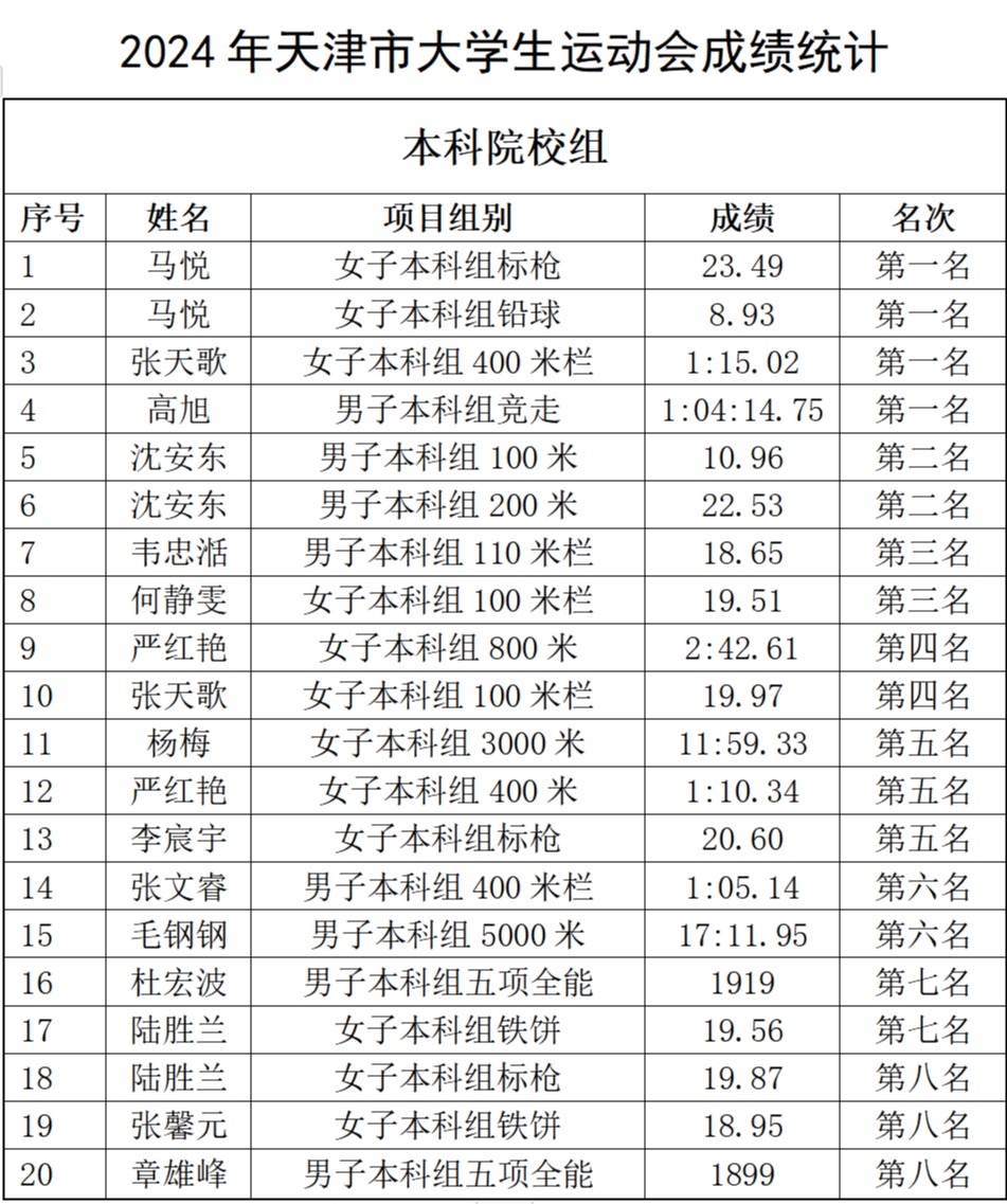 日前,天津市大学生田径运动会在天津财经大学田径场举行。经过激烈比拼,学校最终取得了4个冠军、2个亚军和2个季军,20人次获得前8名。