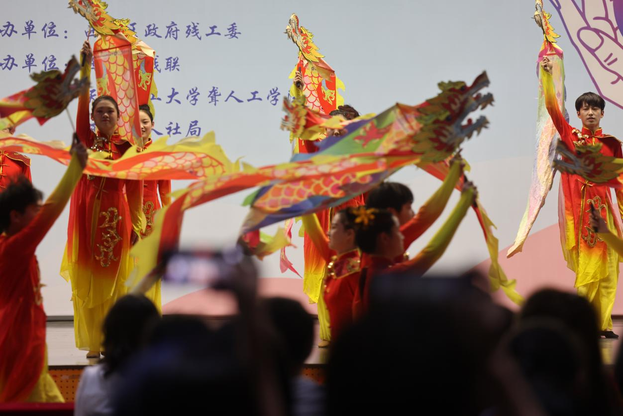 本次助残日系列活动包括助残文艺演出、公益健步行和残疾人专场招聘会。在助残文艺演出中,歌曲、轮椅舞、魔术等节目轮番上演,我校聋人工学院艺术团表演的舞蹈《龙跃中华》,掀起全场热潮,展现了聋工学子顽强拼搏的精神。