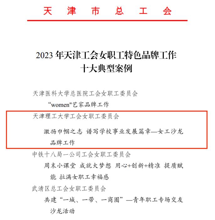 近日,天津市总工会发布了《关于对2023年工会女职工特色品牌建设活动情况的通报》,我校“激扬巾帼之志 谱写学校事业发展篇章——女工沙龙品牌工作”入选2023年天津工会女职工特色品牌工作十大典型案例。