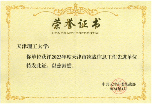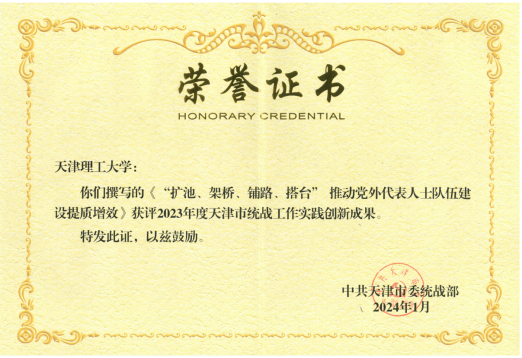 近日,中共天津市委统战部召开全市统战部长会议。会上对2023年度全市统战信息工作先进单位和个人及天津市统战工作实践创新成果进行表彰。我校获评2023年度天津市统战信息工作先进单位,党委统战部鲍晓迪被评为2023年度天津市统战工作优秀信息员。党委统战部撰写的《“扩池、架桥、铺路、搭台”推动党外代表人士队伍建设提质增效》获评2023年度天津市统战工作实践创新成果。