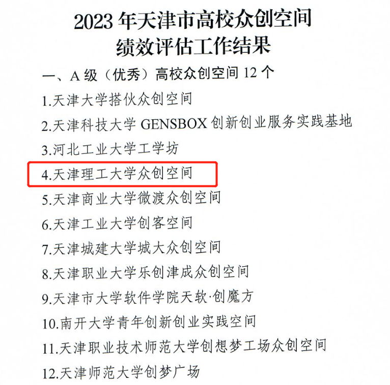 近日,市教育两委公布2023年天津市高校众创空间绩效评估工作结果,经评估数据上报、负责人现场答辩、专家评审、审核及公示等环节,我校众创空间获评2023年度天津市A级(优秀)高校众创空间,这是我校连续第八年获此殊荣。