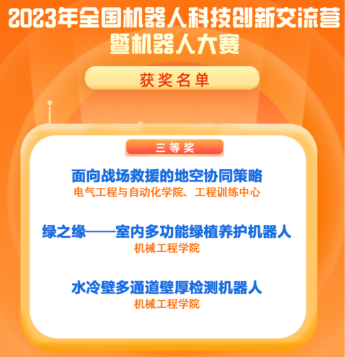 日前,由共青团中央、工业和信息化部主办的2023年全国大学生机器人科技创新交流营暨机器人大赛在山东省日照市举办。我校3件作品荣获三等奖。