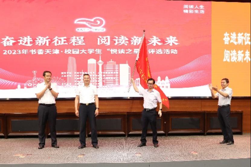 活动颁奖仪式过后,举行了书香天津·校园大学生“悦读之星”会旗交接仪式,党委常委、副校长陈胜勇和图书馆负责同志接过“悦读之星”会旗。