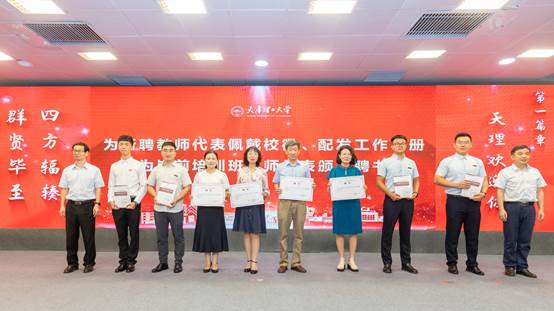 全体新聘教师面向国旗、校旗进行入职宣誓。校领导为新聘教师代表佩戴校徽、颁发教师工作手册、师德建设规范手册,为岗前培训班导师代表颁发聘书;为退休教师代表颁发荣休纪念册,为从教满30年教职工颁发证书;为荣获“天理榜样·最美教师、最美教育工作者”称号的先进个人颁发荣誉证书。新聘教师代表为退休教师代表献花。