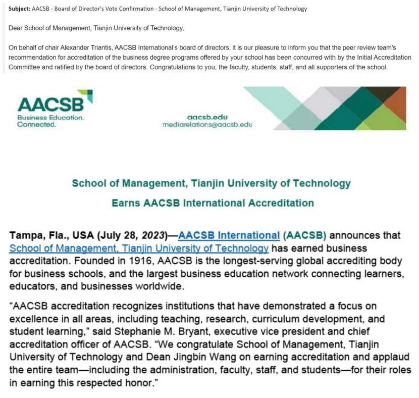近日,国际精英商学院协会(The Association to Advance Collegiate Schools of Business International,简称AACSB)来函确认,经其初始认证委员会(Initial Accreditation Committee)投票通过,国际理事会(Board of Directors)批准,我校管理学院通过AACSB初始认证,认证期限为5年,成为全球不到6%获此殊荣的商学院之一。这标志着管理学院成为中国内地第48所,市属高校第一所通过AACSB认证的商科学院。