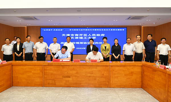 为深入开展学习贯彻习近平新时代中国特色社会主义思想主题教育,推进理论学习与事业发展相融相促,努力在以学促干上取得实实在在的成效,7月10日,校党委书记刘东志,校党委副书记、校长练继建率校院两级党委理论学习中心组成员赴天开高教科创园,与南开区委理论学习中心组开展调研联学暨战略合作框架协议签订仪式。南开区委书记马珊珊,区委副书记、区长聂伟迅及区委理论学习中心组成员、相关委办局负责同志参加。