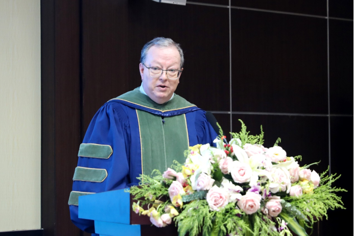 Brett Fairbairn高度赞扬两校20余年卓有成效的长期合作,并寄语毕业生要勇于实践、敢于奉献,要铭记此刻的成功,以自己的勇气、力量面对未来的挑战和逆境。