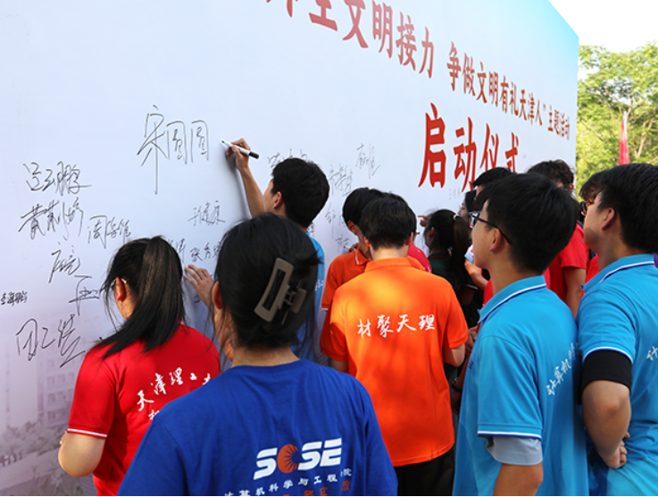 活动现场师生员工代表在“百万师生文明接力 争做文明有礼天津人”主题背景板签名承诺并领取主题活动宣传折页。