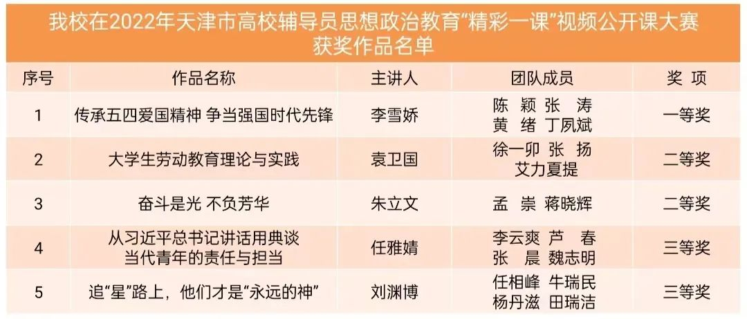 为学习宣传贯彻习近平新时代中国特色社会主义思想,落实立德树人根本任务,着力提升思想政治教育的实效性、针对性和亲和力,引导广大学生深刻体会“两个确立”的决定性意义,深化爱党爱国爱人民爱社会主义教育,市委教育工委 市教委举办了2022年天津市高校辅导员思想政治教育“精彩一课”视频公开课大赛,我校积极组织、精心准备,经过专家评委评审,我校在此次大赛中被评为“优秀组织单位”,荣获一等奖1项,二等奖2项,三等奖2项。