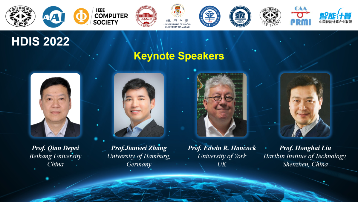 中国科学院院士北京航空航天大学钱德沛教授、德国国家工程科学院院士德国汉堡大学张建伟教授、欧洲科学院院士哈尔滨工业大学(深圳)刘洪海教授、英国皇家工程院院士英国约克大学Edwin R. Hancock教授在会议上作主题演讲。