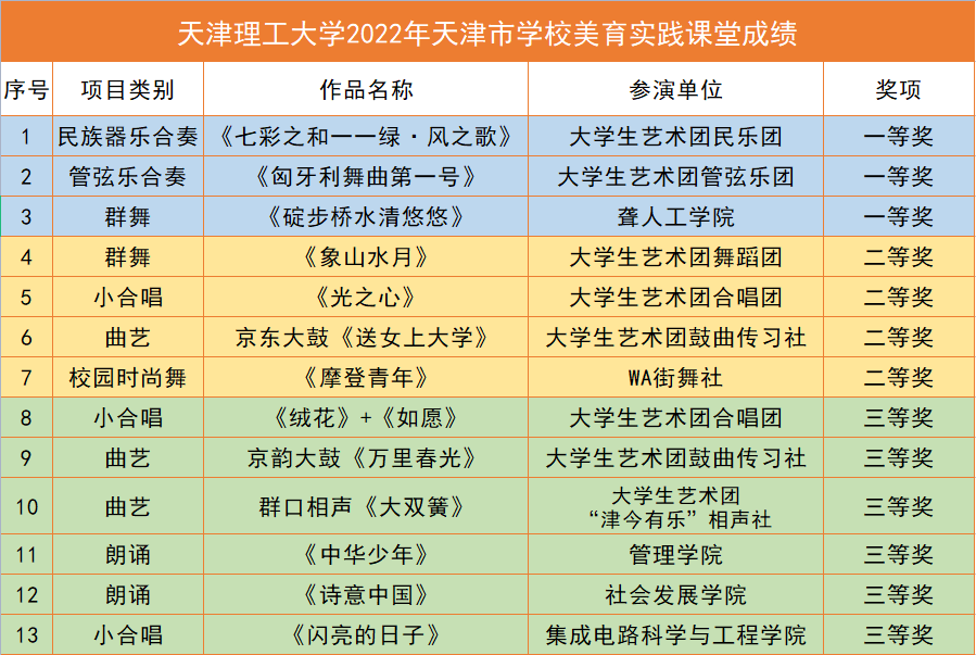 近日,天津市教育委员会主办的2022年天津市学校美育实践课堂集体项目展演结果正式公布,我校获评13个市级奖项,包括民族乐器合奏、管弦乐合奏、群舞、小合唱、曲艺、校园时尚舞蹈、朗诵等项目,其中一等奖3项、二等奖4项、三等奖6项。