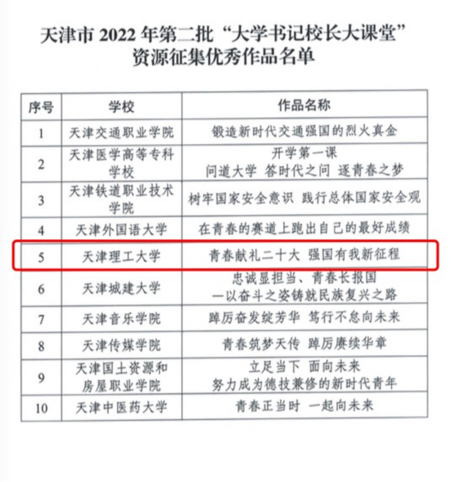 近日,市教育两委公布天津市第二批“大学书记校长大课堂”相关资源评审结果,我校党委书记刘东志为师生讲授的秋季学期形势政策教育开学第一课《青春献礼二十大 强国有我新征程》被评为优秀作品。这是继我校获评首次“大学书记校长大课堂”2项优秀资源后再次成功入选。