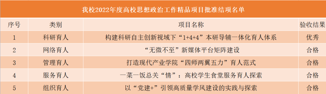 近日,根据《市委教育工委 市教委关于开展天津市高校思想政治工作精品项目培育建设的通知》,经专家组评审,我校5个2022年度天津市高校思想政治工作精品项目均顺利获批结项,其中1项优秀、4项合格。