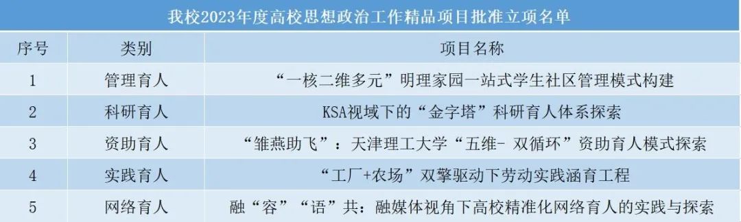 同时,根据《市委教育工委 市教委关于开展2023年高校思想政治工作精品项目申报及2022年高校思想政治工作精品项目验收的通知》,经学校推荐、专家组评审,我校在管理育人、科研育人、资助育人、实践育人以及网络育人类别中共5个项目脱颖而出入选2023年度天津市高校思想政治工作精品项目批准立项名单。