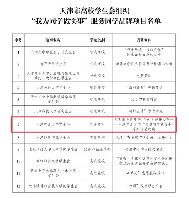 近日,天津市学联发布关于天津市高校学生会组织“我为同学做实事”服务同学品牌项目的通报。全市各高校共申报项目49个,经过校级推荐、项目初评、市级终评,12个项目获评天津市高校学生会组织“我为同学做实事”服务同学品牌活动项目,我校“时时服务青年需,处处办好暖心事——‘我为同学做实事’系列活动”项目成功入选。