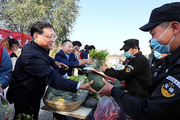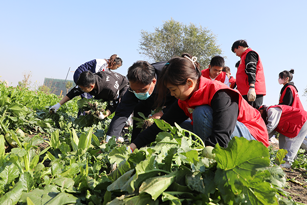 校领导与同学们走进明理农场沉浸在丰收的喜悦与自豪之中。大家将劳动成果分享给为学校默默付出的工勤与安保人员,感谢他们在疫情期间舍小家顾大家,坚守在校园服务保障的岗位上。