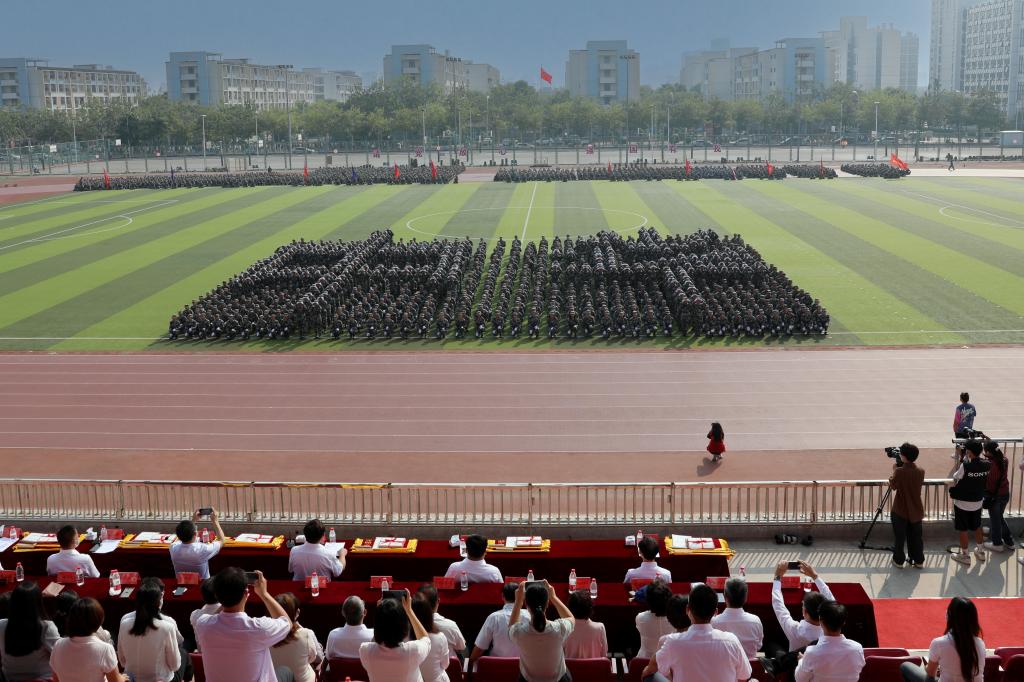 开学典礼上,校领导为新生代表佩戴校徽,7800余名新生共同分享成为“天理人”的喜悦之情。