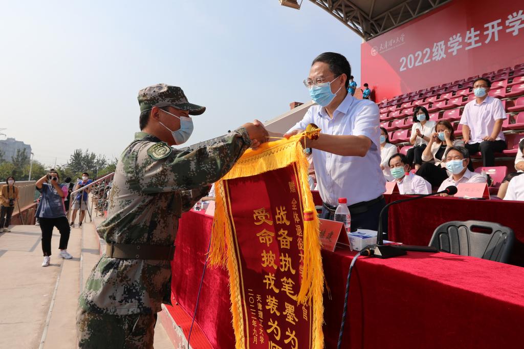 校长练继建向获得本次军训特殊贡献奖的在校退役大学生教练员集体赠送锦旗。