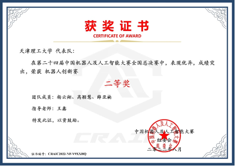 近日,第二十四届中国机器人及人工智能大赛开启巅峰对决。经过省赛和国赛的激烈竞争,我校师生代表队成绩突出,工程训练中心教师王鑫指导,集成电路科学与工程学院杨云翔、高颖慧和电气工程与自动化学院薛亚楠学生团队的《基于物联网的智慧农业室内无人机喷洒系统》项目荣获国家级二等奖;《基于人工智能的电机故障诊断系统》和《低功耗智能防疫测温小车》等2个项目分获天津市级二等奖、三等奖。
