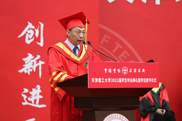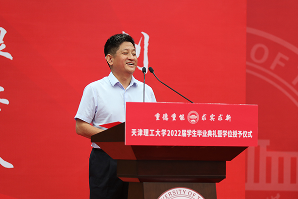 校友代表、天理校友会副会长、校友企业家联合会轮值会长、天津友发钢管集团股份有限公司监事会主席、天津友发管道科技有限公司董事长、1986届机电专业毕业生陈克春以学长的身份鼓励毕业生满怀勇气步入社会,带着感恩之心踏上未来的旅途,也带着感恩之心回馈父母、回馈母校、回馈社会,以国家、民族为念,不懈奋斗,在中华民族实现伟大复兴的征程中贡献青春力量,母校、校友会、校友企业家联合会是大家最坚实的后盾。