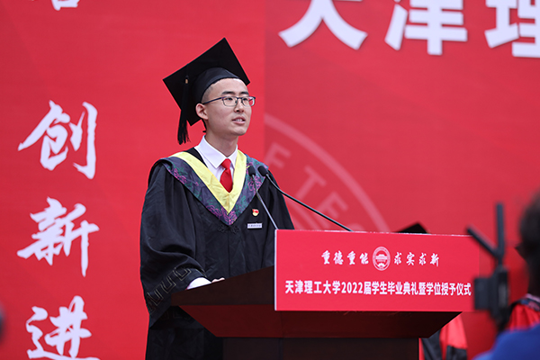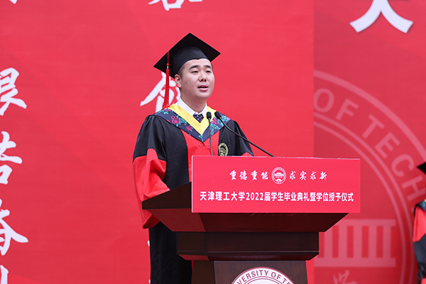 本科毕业生代表、电气工程与自动化学院张子轩满怀深情地回顾了四年大学时光,感恩学校的培养,老师的教导和同学的陪伴,表示要将天理青年的青春梦想和中华民族伟大复兴的中国梦紧密相连,不负韶华、不负时代、不负人民,跑出“天理人”的风采。