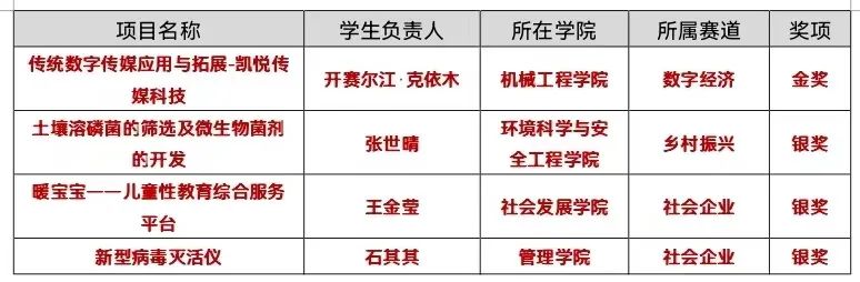 自竞赛开始以来,学校广泛宣传和组织动员,学生团队踊跃报名参赛,经过评委线上评审、选手线上路演答辩等环节,机械工程学院2018级本科生开赛尔江·克依木项目团队的作品《传统数字传媒应用与拓展-凯悦传媒科技》获得金奖并入围国赛。环境科学与安全工程学院2020级本科生张世晴项目团队作品《土壤溶磷菌的筛选及微生物菌剂的开发》,社会发展学院2020级本科生王金莹项目团队作品《暖宝宝——儿童性教育综合服务平台》,管理学院2020级本科生石其其项目团队作品《新型病毒灭活仪》获得银奖。