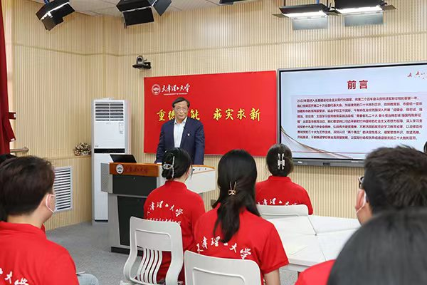 为全面贯彻习近平新时代中国特色社会主义思想,深入学习贯彻党的十九届六中全会精神,深刻领会和贯彻落实习近平总书记在中国人民大学考察时的重要讲话精神及市委常委会会议精神,不断巩固拓展党史学习教育成果,深刻认识“两个确立”的决定性意义,引导广大青年坚定不移听党话、跟党走,努力成长为担当民族复兴大任的时代新人,在中国共产主义青年团成立100周年之际,五四青年节当日,校党委书记刘东志通过线上线下相结合的方式为全体学生讲授2022年形势政策教育开学第一课。校党委副书记杜长有主持。
