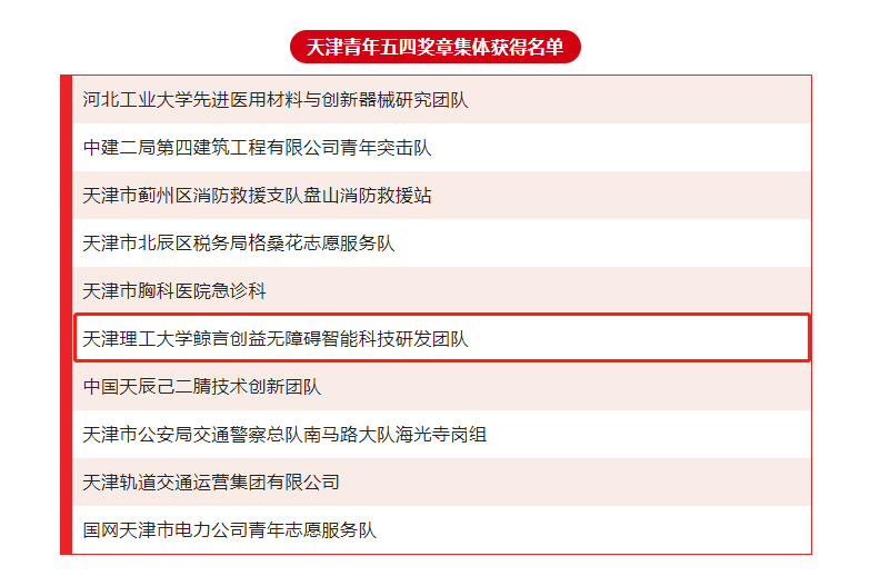 在五四青年节来临之际,“天津青年五四奖章”评选结果揭晓。团市委决定,授予60名同志“天津青年五四奖章”称号,授予10个集体“天津青年五四奖章集体”称号。作为全市教育系统2个获奖集体之一,我校鲸言创益无障碍智能科技研发团队荣获“天津青年五四奖章集体”称号,实现学校在该奖项中“零的突破”。