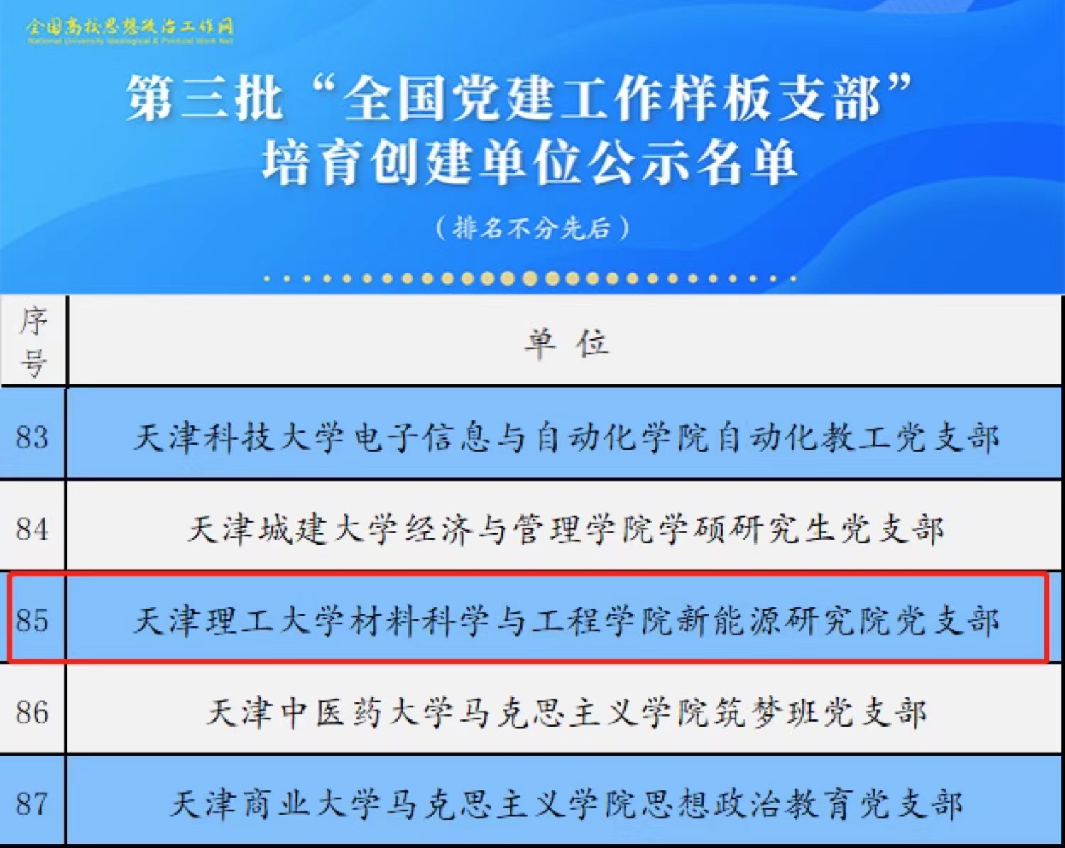 日前,教育部思想政治工作司发布第三批全国党建工作示范高校、标杆院系、样板支部培育创建单位名单,我校材料科学与工程学院新能源研究院党支部成功入选《第三批“全国党建工作样板支部”培育创建单位名单》。