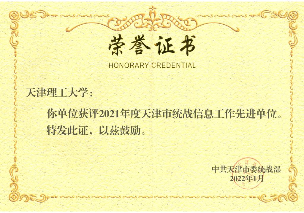 为推动全市统战工作发展,提高统战信息的质量和水平,市委统战部总结2021年度天津市统战信息工作情况,对被评为2021年度天津市统战信息工作先进单位和天津市统战工作优秀信息员的单位及个人予以表彰。我校荣获“2021年度天津市统战信息工作先进单位”称号,党委统战部鲍晓迪被评为“2021年度天津市统战工作优秀信息员”。