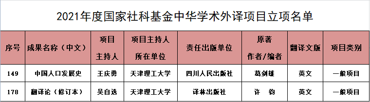 近日,全国哲学社会科学工作办公室公布了2021年度国家社科基金中华学术外译项目立项名单。全国共有237项课题获批立项。天津市获批4项,我校斩获2项。这是我校首次同年度获批2项国家社科基金中华学术外译项目,实现新突破。