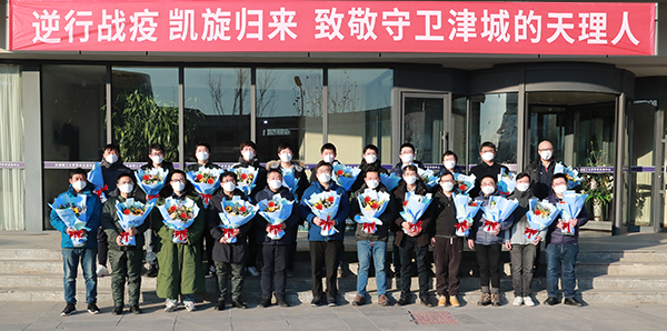 1月29日下午,校领导刘东志、练继建、郭滇华、杜长有、郑清春、魏东、张继东在学校迎接23名驰援津南抗疫干部教师凯旋。