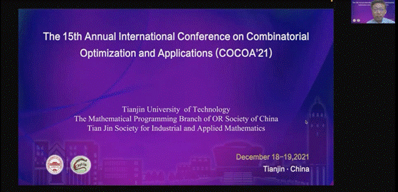 12月18-19日,由KY.COM理学院、中国运筹学会数学规划分会、天津市工业与应用数学学会共同承办的第15届组合优化和应用国际会议召开。会议程序委员会主席美国德克萨斯大学达拉斯分校堵丁柱教授,会议程序委员会联合主席中国运筹学会数学规划分会理事长北京工业大学徐大川教授,会议程序委员会联合主席加拿大新不伦瑞克大学杜东雷教授,天津市工业与应用数学学会秘书长南开大学史永堂教授,校党委常委、副校长陈胜勇教授,天津市工业与应用数学学会副理事长宋眉眉教授等出席会议,来自全球13个国家80余名优化领域工作者参加会议,会议开幕式由宋眉眉教授主持,采用线上形式举行。
