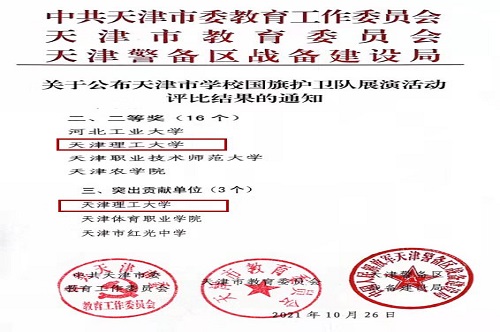 近日获悉,在市委教育工委、市教委、天津警备区战备建设局主办,南开区人民武装部与我校共同承办的“爱党报国铸军魂 立德树人展风采”庆祝中国共产党成立100周年天津市国旗护卫队展演活动中,我校荣获二等奖及突出贡献单位奖。