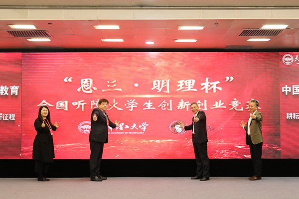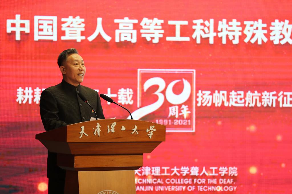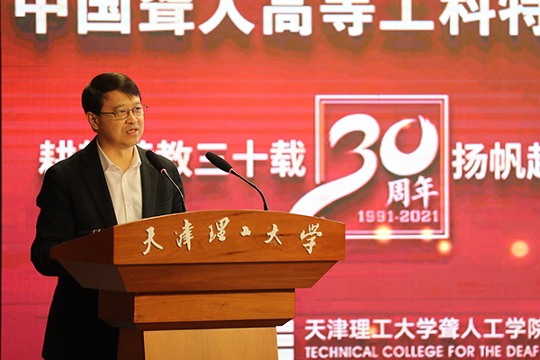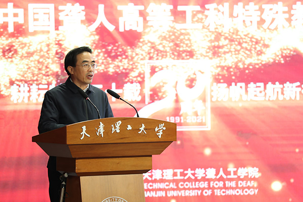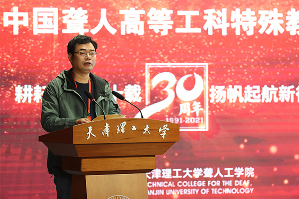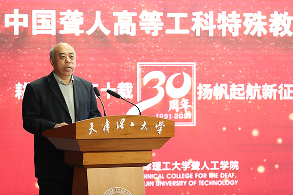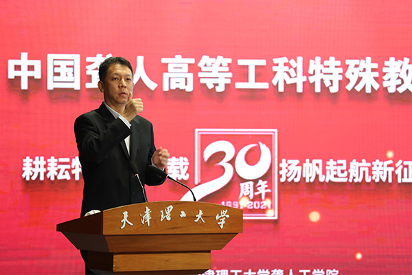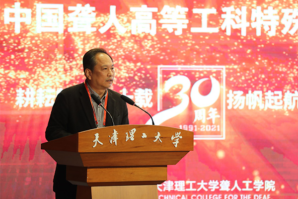 校长杨庆新在致辞中回顾了学校自创办中国聋人高等工科特殊教育的发展历程和教育教学成果。他指出,一直以来,学校坚持五育并举,落实立德树人根本任务,认真贯彻党的教育方针,牢牢把握社会主义办学方向,努力培养德智体美劳全面发展的社会主义建设者和接班人;坚持改革创新,健全完善特殊教育培养模式,首创“全校参与、跨学院联合培养”的听障本科生全纳教育培养模式;坚持博采众长,不断深化对外交流,先后与美国罗切斯特理工学院、俄罗斯莫斯科鲍曼国立技术大学、日本筑波技术大学等国际著名特殊教育学院建立了良好合作关系。杨庆新表示,在习近平新时代中国特色社会主义思想指引下,在中国残联和教育部的亲切关怀下,在天津市委市政府的关心支持下,学校必将围绕立德树人根本任务,牢牢把握特殊教育事业发展新机遇,努力把聋人工学院建设成为国内领先、国际一流的高等特殊教育学院,为我国特殊教育事业发展作出新的更大贡献。