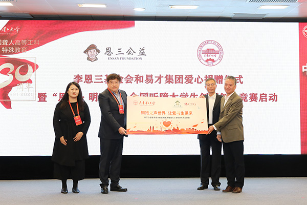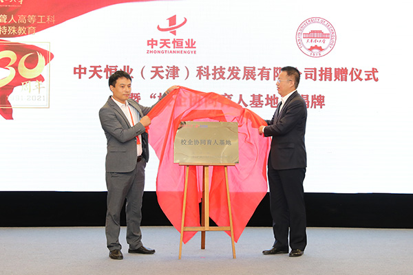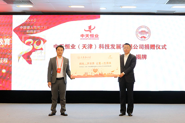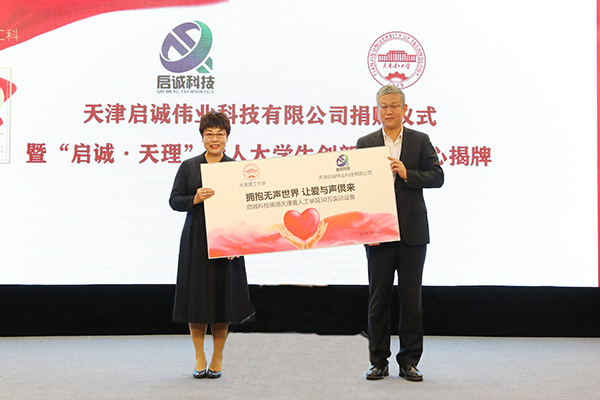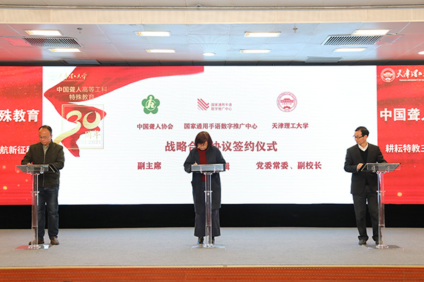 在签约捐赠仪式上,学校与中国聋人协会、国家通用手语数字推广中心(华夏出版社)共同签署战略合作协议,联合成立无障碍智能科技研发中心,在加强手语规范化、信息化、标准化建设,大力推广国家通用手语,为听力残疾人提供无障碍的语言文字服务等方面进行深入合作。中天恒业(天津)科技发展有限公司为学校捐赠语音转换设备并共建“校企协同育人基地”。天津启诚伟业科技有限公司为学校捐赠实验设备,与聋人工学院共建“启诚•天理”聋人大学生创新实践中心(实验室),通过校企合作的形式共同培育听障大学生创新创业能力。李恩三基金会和易才集团为学校进行爱心捐赠,捐赠主要用于每年开展面向全国残疾大学生的学科竞赛、共同研发残疾人课程以及残健同舟平台建设等,双方共同启动首届“恩三•明理杯”全国听障大学生创新创业竞赛。