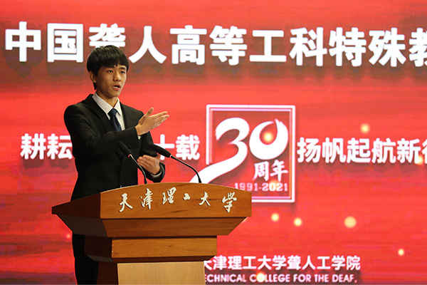 聋人工学院2003届毕业生、2019年残运会火炬手、天津市残疾人联合会第七届执行理事会理事张岩代表校友致辞,倡议毕业生们继续为母校的发展贡献绵薄之力,共同推动特殊教育事业长远发展,为残疾人事业注入青春力量。
