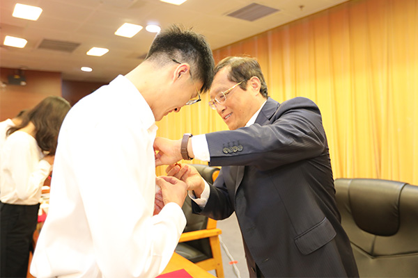 仪式在雄壮的国歌声中拉开序幕。校领导为新聘教师代表佩戴校徽,颁发《教师工作手册》《师德专题教育学习手册》《师德师风建设规范手册》,为岗前培训班导师代表颁发聘书,为退休教师代表颁发荣休纪念册。
