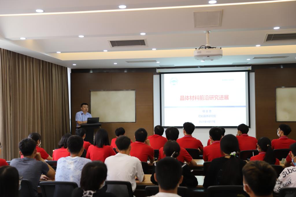仪式结束后,功能晶体研究院院长胡章贵以《晶体材料前沿研究进展》为题为同学们讲授专业第一课。